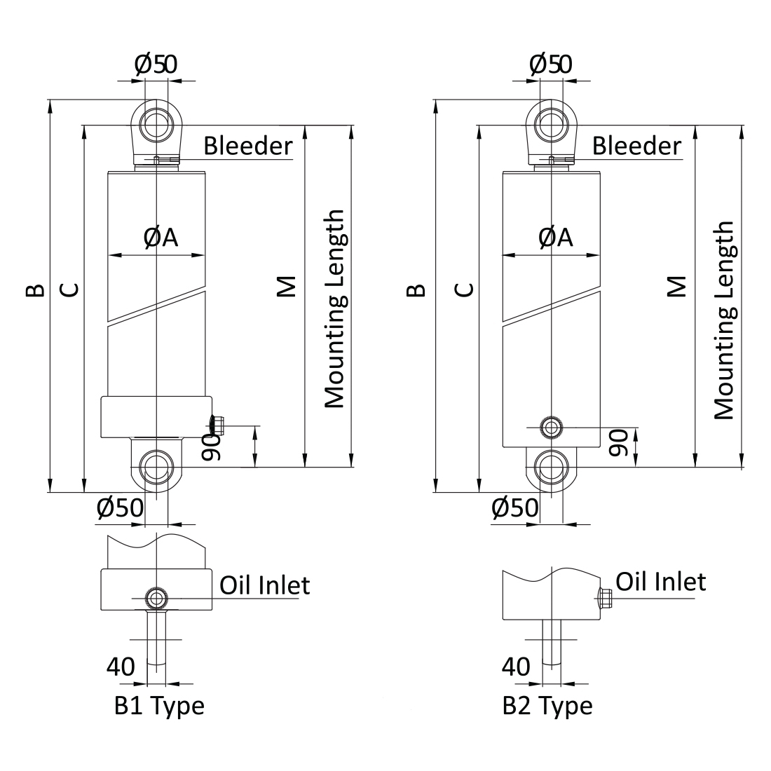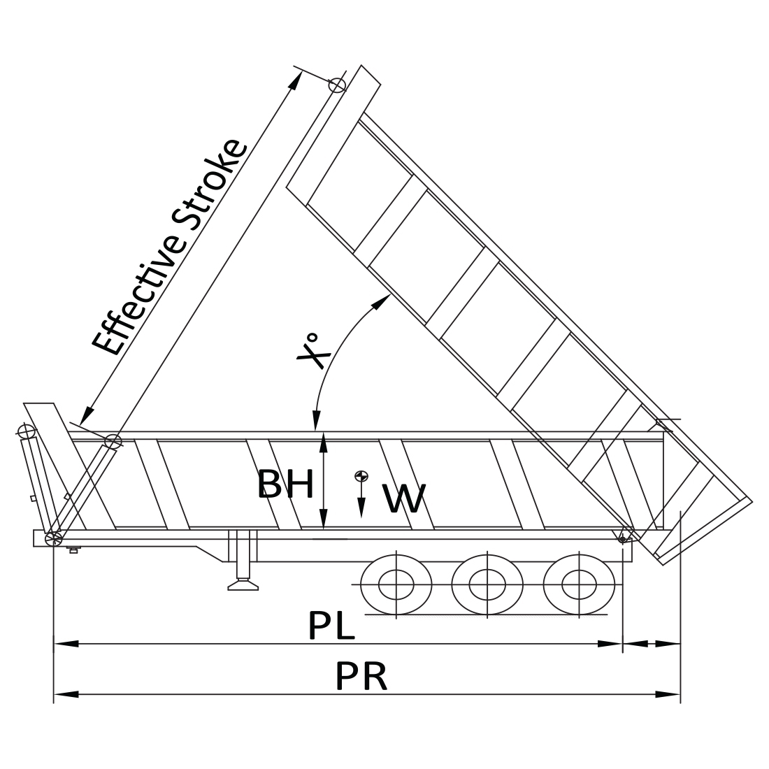 | Product Code | Stage Number | PR (mm) | RO (mm) | BH (mm) | X° | Max. Tipping Weight (ton) | Weight (kg) | Oil Cap. (lt) | Stroke (mm) | ØA (mm) | B (mm) | C (mm) | Oil Inlet " | M (mm) | |